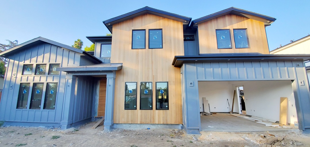 gutters match the color of the wood. The stucco is
